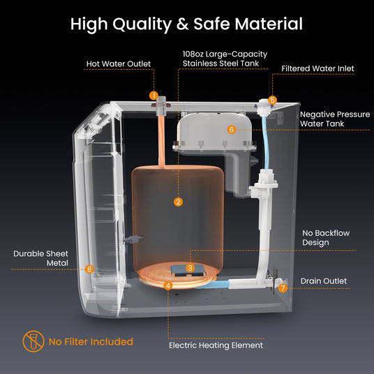 Featuring a 108 oz food-grade stainless steel tank and advanced non-contact heating technology, WINTEMP ensures every sip is clean and fresh. It effectively prevents scale buildup, maintaining high water quality for years of use.